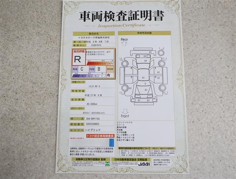 詳細及び現状の車両状態につきましては、店舗スタッフまでお尋ねください。 - 注2)上記と同様の評価点・状態表を「車両検査証明書」として店舗の展示車両に搭載しております。