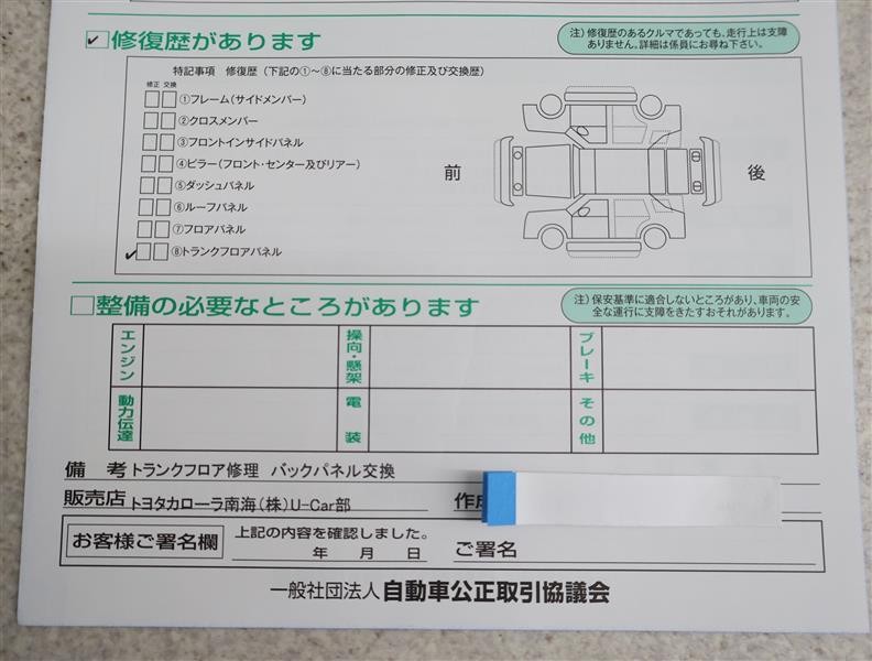 - 「修復歴あり」の場合、修復部位の詳細につきましては、販売店へお問合せください。