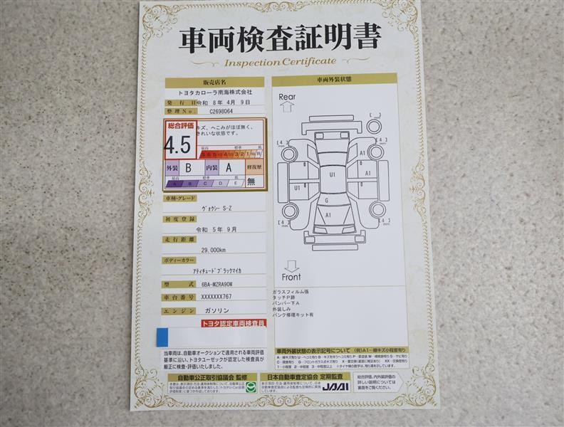 詳細及び現状の車両状態につきましては、店舗スタッフまでお尋ねください。 - 注2)上記と同様の評価点・状態表を「車両検査証明書」として店舗の展示車両に搭載しております。