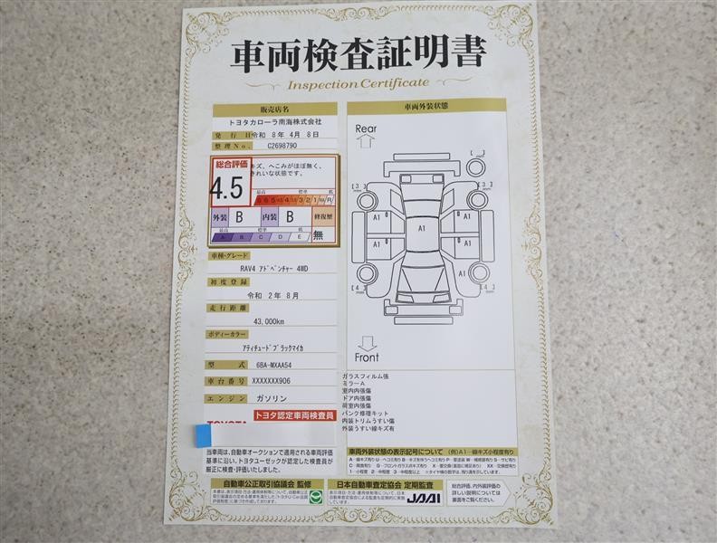 上記と同様の評価点・状態表を「車両検査証明書」として店舗の展示車両に搭載しております。