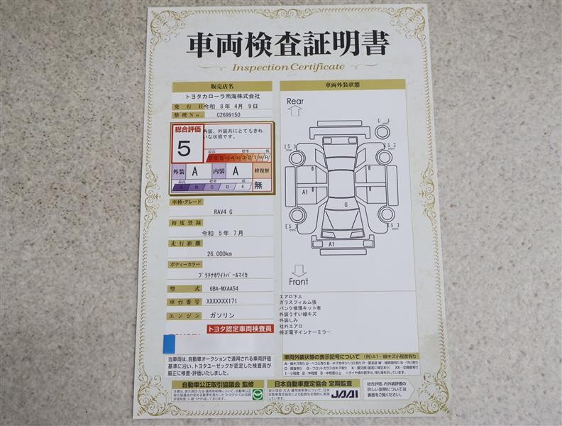 詳細及び現状の車両状態につきましては、店舗スタッフまでお尋ねください。 - 注2)上記と同様の評価点・状態表を「車両検査証明書」として店舗の展示車両に搭載しております。