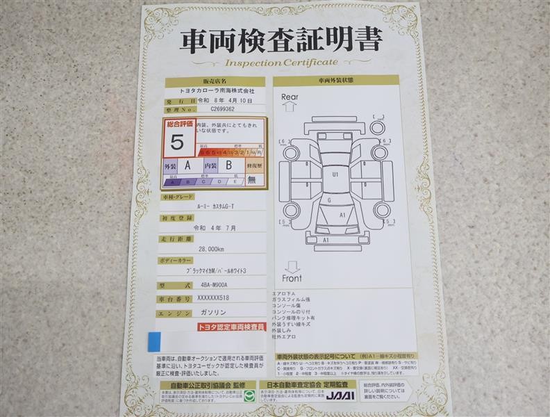 詳細及び現状の車両状態につきましては、店舗スタッフまでお尋ねください。 - 注2)上記と同様の評価点・状態表を「車両検査証明書」として店舗の展示車両に搭載しております。
