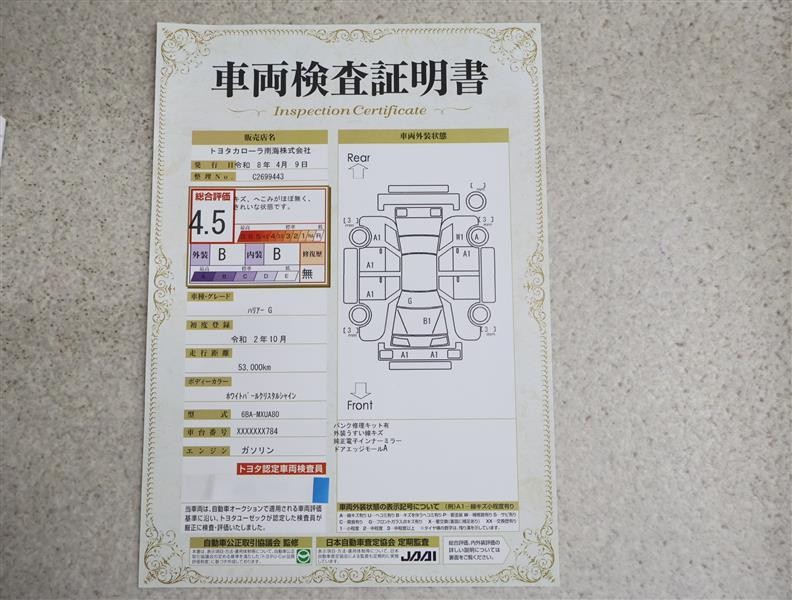 詳細及び現状の車両状態につきましては、店舗スタッフまでお尋ねください。 - 注2)上記と同様の評価点・状態表を「車両検査証明書」として店舗の展示車両に搭載しております。