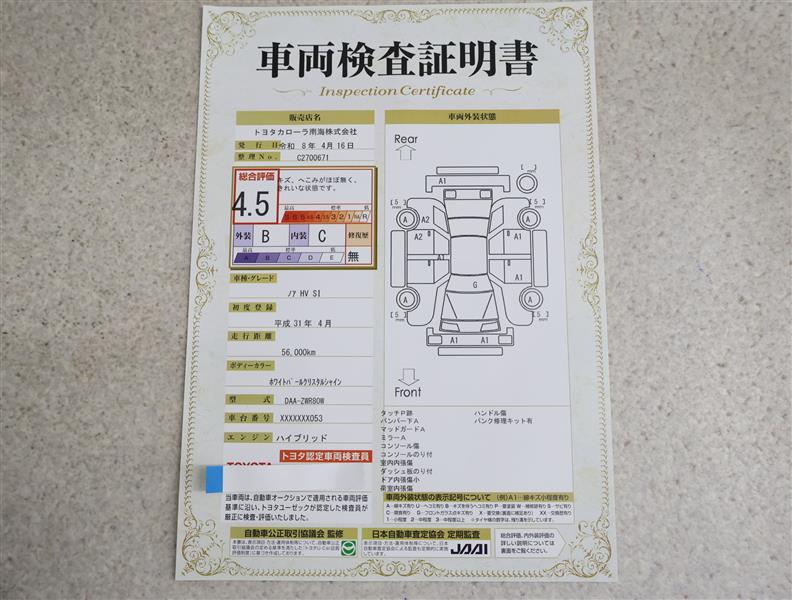 上記と同様の評価点・状態表を「車両検査証明書」として店舗の展示車両に搭載しております。