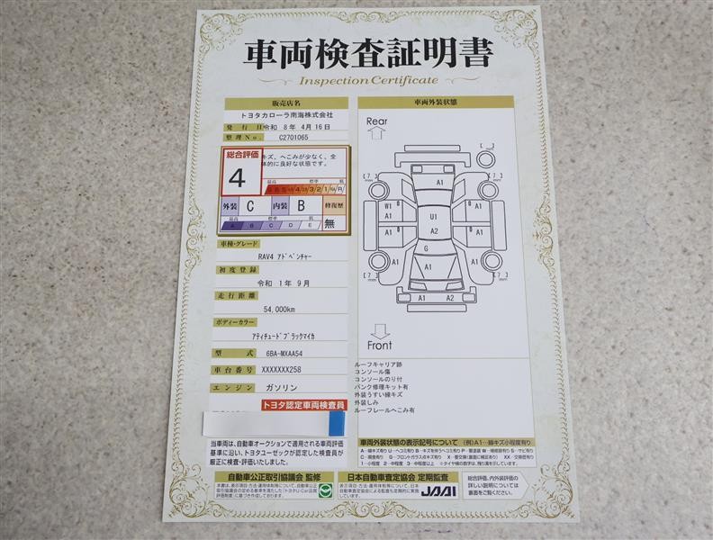 上記と同様の評価点・状態表を「車両検査証明書」として店舗の展示車両に搭載しております。