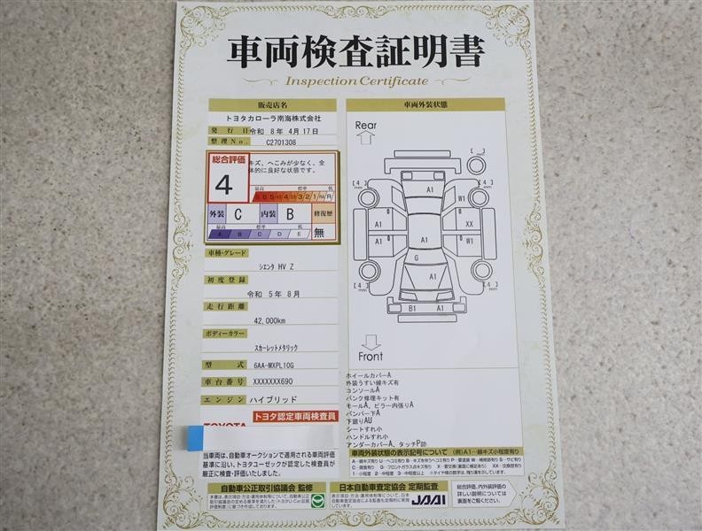 上記と同様の評価点・状態表を「車両検査証明書」として店舗の展示車両に搭載しております。