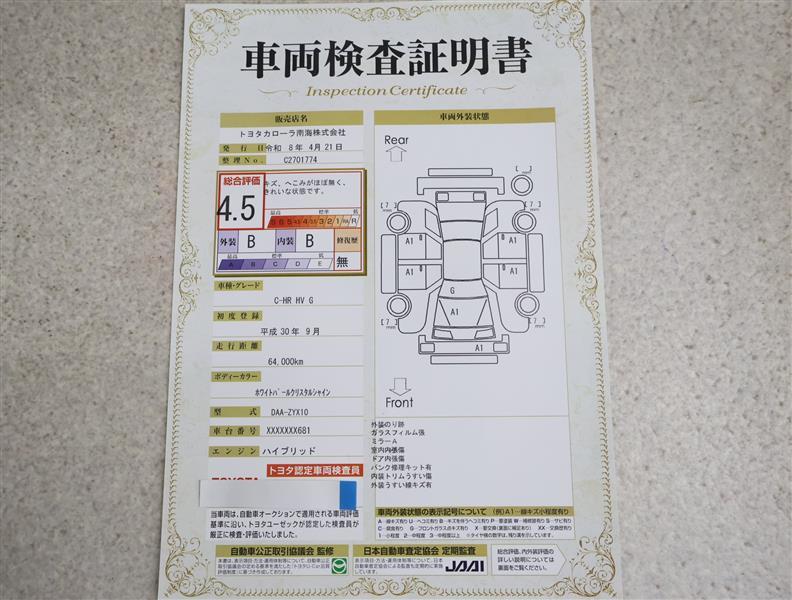 上記と同様の評価点・状態表を「車両検査証明書」として店舗の展示車両に搭載しております。