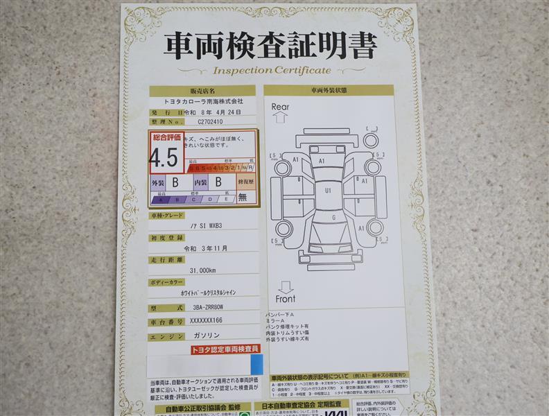 上記と同様の評価点・状態表を「車両検査証明書」として店舗の展示車両に搭載しております。