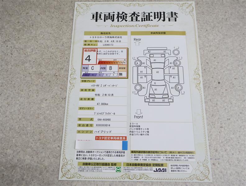 上記と同様の評価点・状態表を「車両検査証明書」として店舗の展示車両に搭載しております。