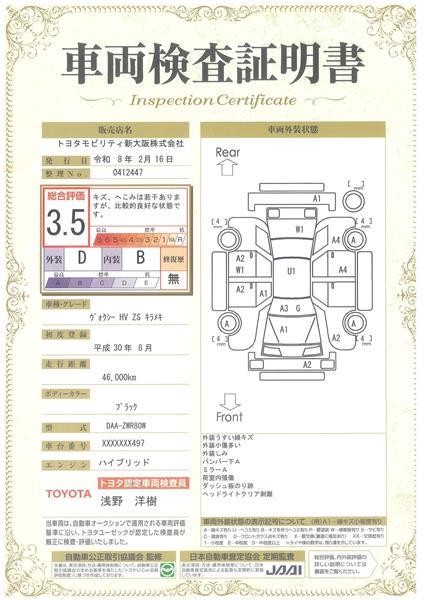 詳細及び現状の車両状態につきましては、店舗スタッフまでお尋ねください。 - 注2)上記と同様の評価点・状態表を「車両検査証明書」として店舗の展示車両に搭載しております。