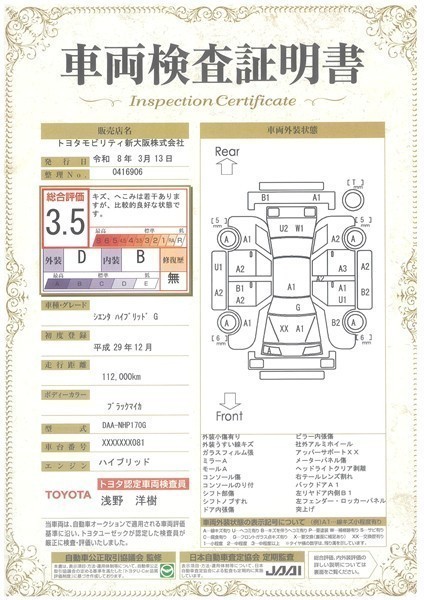 上記と同様の評価点・状態表を「車両検査証明書」として店舗の展示車両に搭載しております。