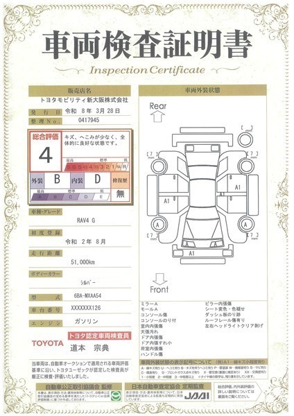 詳細及び現状の車両状態につきましては、店舗スタッフまでお尋ねください。 - 注2)上記と同様の評価点・状態表を「車両検査証明書」として店舗の展示車両に搭載しております。