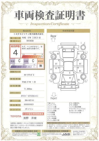 詳細及び現状の車両状態につきましては、店舗スタッフまでお尋ねください。 - 注2)上記と同様の評価点・状態表を「車両検査証明書」として店舗の展示車両に搭載しております。