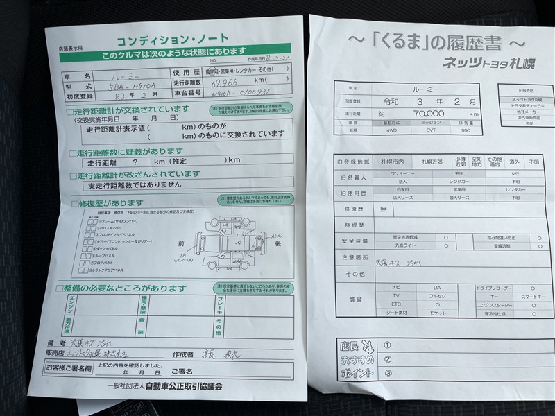 詳細及び現状の車両状態につきましては、店舗スタッフまでお尋ねください。 - 注2)上記と同様の評価点・状態表を「車両検査証明書」として店舗の展示車両に搭載しております。