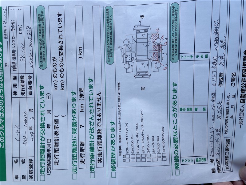 上記と同様の評価点・状態表を「車両検査証明書」として店舗の展示車両に搭載しております。