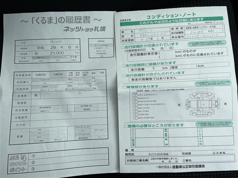 詳細及び現状の車両状態につきましては、店舗スタッフまでお尋ねください。 - 注2)上記と同様の評価点・状態表を「車両検査証明書」として店舗の展示車両に搭載しております。