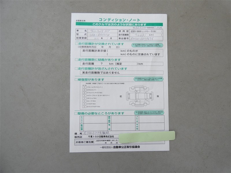 詳細及び現状の車両状態につきましては、店舗スタッフまでお尋ねください。 - 注2)上記と同様の評価点・状態表を「車両検査証明書」として店舗の展示車両に搭載しております。