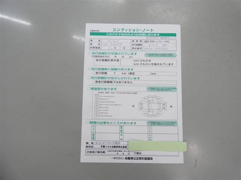 詳細及び現状の車両状態につきましては、店舗スタッフまでお尋ねください。 - 注2)上記と同様の評価点・状態表を「車両検査証明書」として店舗の展示車両に搭載しております。