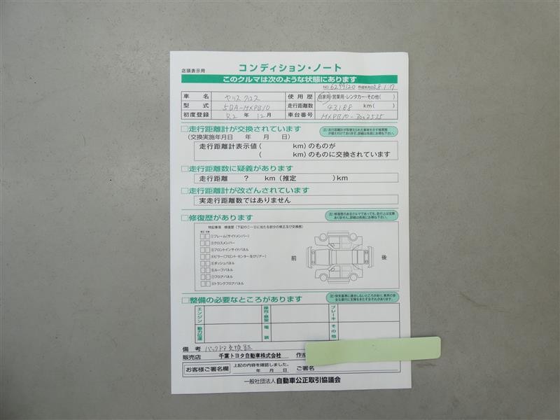 詳細及び現状の車両状態につきましては、店舗スタッフまでお尋ねください。 - 注2)上記と同様の評価点・状態表を「車両検査証明書」として店舗の展示車両に搭載しております。