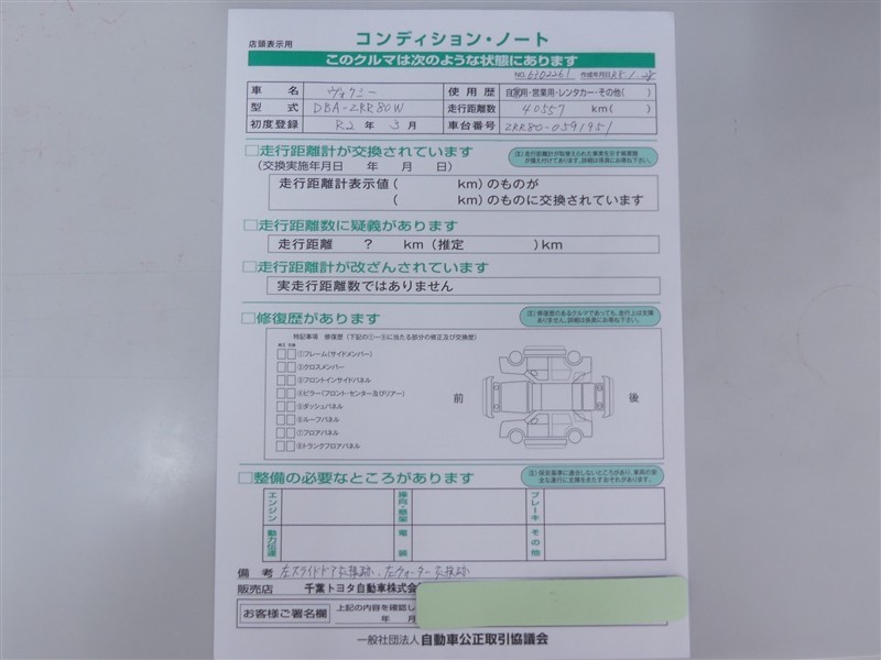 詳細及び現状の車両状態につきましては、店舗スタッフまでお尋ねください。 - 注2)上記と同様の評価点・状態表を「車両検査証明書」として店舗の展示車両に搭載しております。
