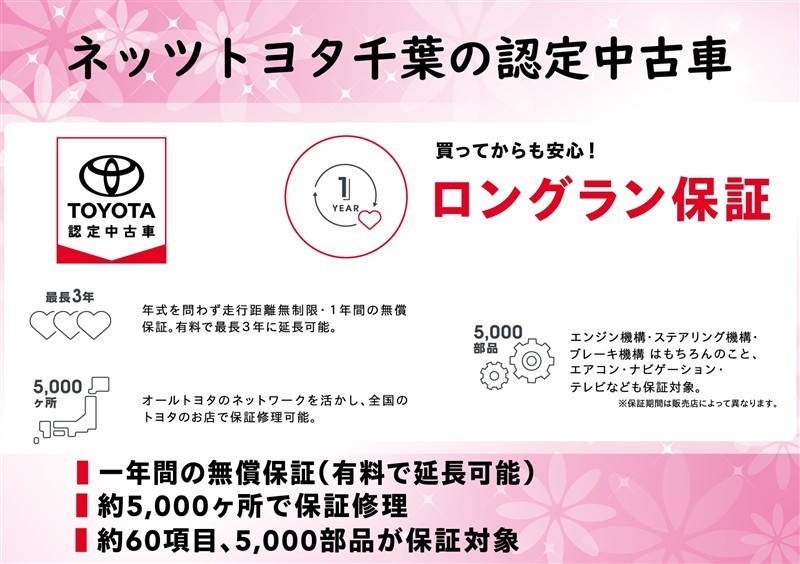| 通常のロングラン保証1年(基本保証)に2年プラスし(=3年保証)最大限の安心をご提供したプランです。 | ネッツトヨタ千葉が長年培ってきた技術で愛車を丁寧にメンテナンス。定期的な点検整備の実施で安心のカーライフを♪ 次回車検時の基本整備費用も含まれております。 |