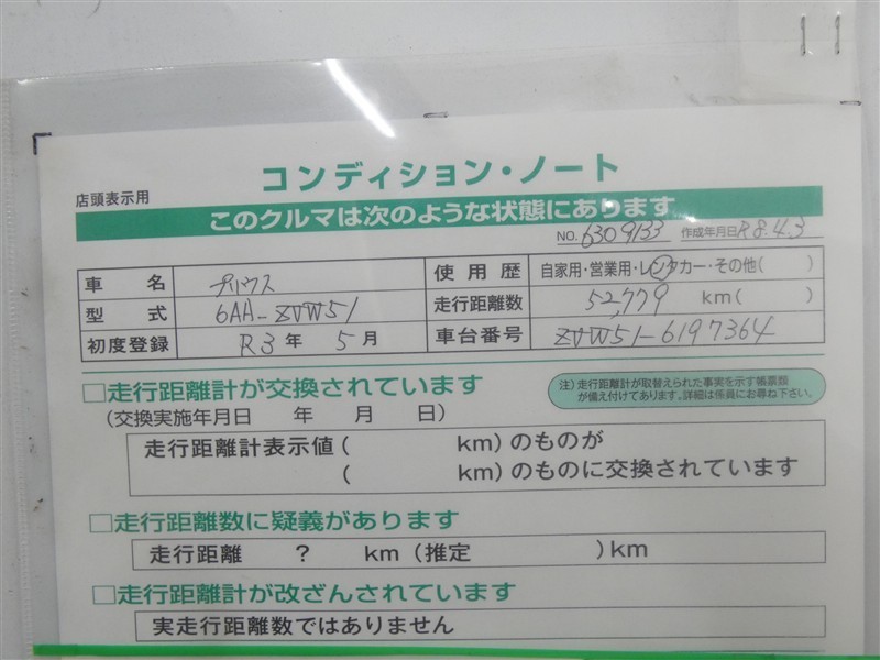 詳細及び現状の車両状態につきましては、店舗スタッフまでお尋ねください。 - 注2)上記と同様の評価点・状態表を「車両検査証明書」として店舗の展示車両に搭載しております。