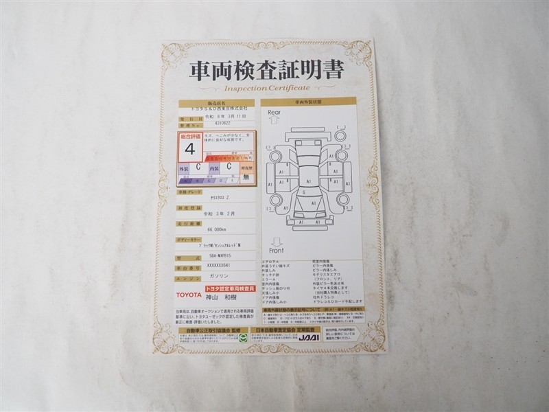詳細及び現状の車両状態につきましては、店舗スタッフまでお尋ねください。 - 注2)上記と同様の評価点・状態表を「車両検査証明書」として店舗の展示車両に搭載しております。