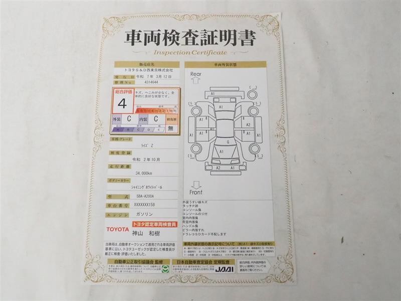 詳細及び現状の車両状態につきましては、店舗スタッフまでお尋ねください。 - 注2)上記と同様の評価点・状態表を「車両検査証明書」として店舗の展示車両に搭載しております。