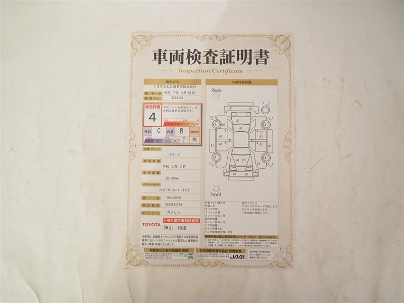 詳細及び現状の車両状態につきましては、店舗スタッフまでお尋ねください。 - 注2)上記と同様の評価点・状態表を「車両検査証明書」として店舗の展示車両に搭載しております。