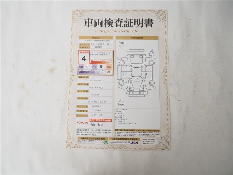 詳細及び現状の車両状態につきましては、店舗スタッフまでお尋ねください。 - 注2)上記と同様の評価点・状態表を「車両検査証明書」として店舗の展示車両に搭載しております。