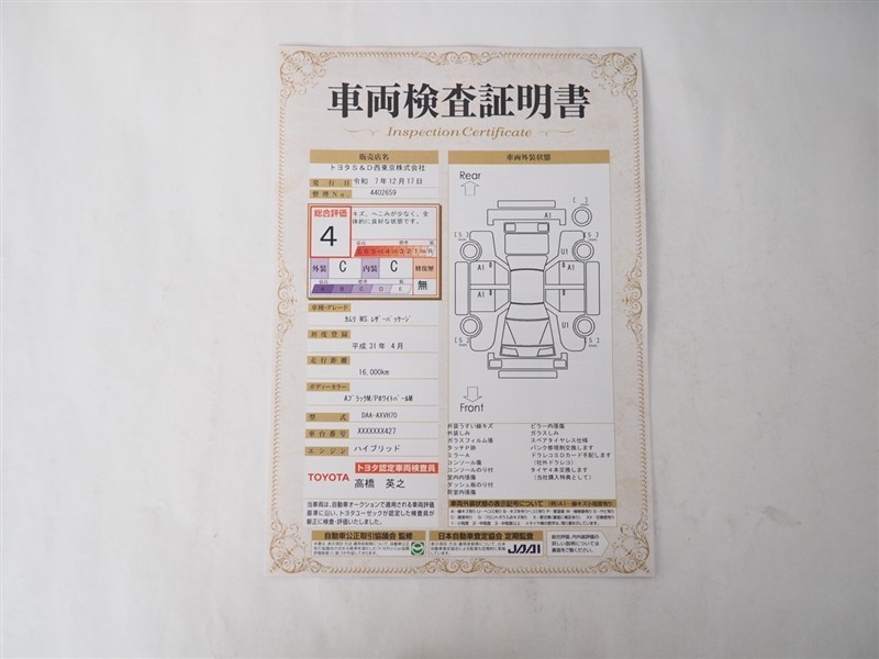 詳細及び現状の車両状態につきましては、店舗スタッフまでお尋ねください。 - 注2)上記と同様の評価点・状態表を「車両検査証明書」として店舗の展示車両に搭載しております。