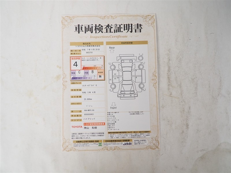詳細及び現状の車両状態につきましては、店舗スタッフまでお尋ねください。 - 注2)上記と同様の評価点・状態表を「車両検査証明書」として店舗の展示車両に搭載しております。