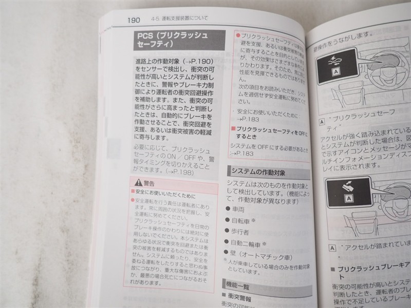 - 予防安全装置の各機能の作動には、速度や対象物等の条件があります。また、道路状況、車両状態、天候等により作動しない場合があります。