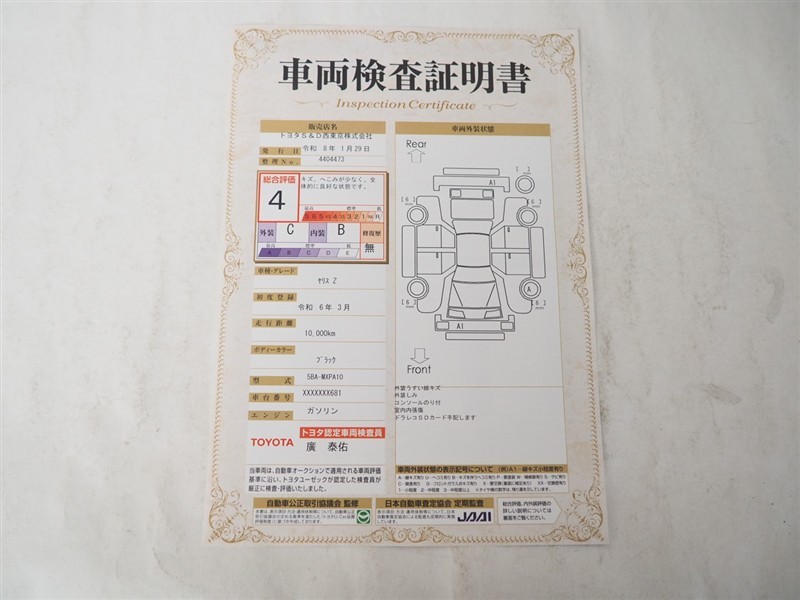 詳細及び現状の車両状態につきましては、店舗スタッフまでお尋ねください。 - 注2)上記と同様の評価点・状態表を「車両検査証明書」として店舗の展示車両に搭載しております。