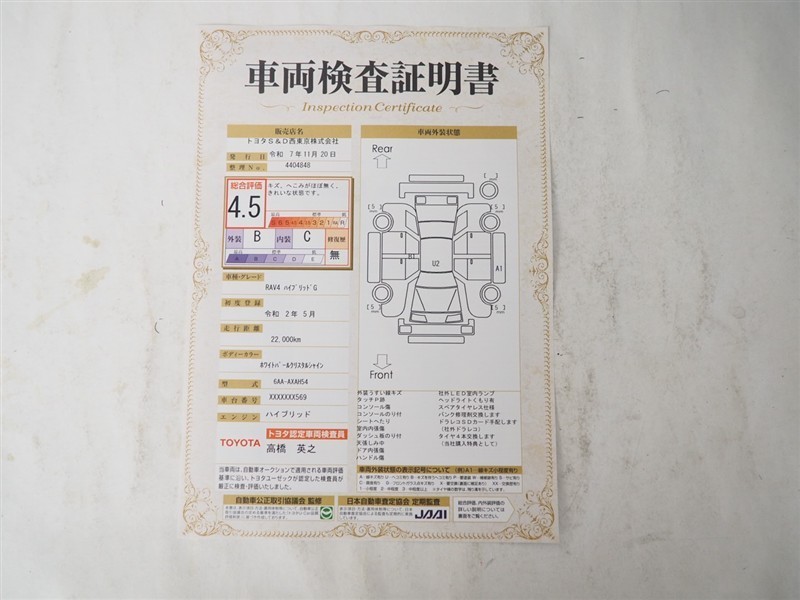 詳細及び現状の車両状態につきましては、店舗スタッフまでお尋ねください。 - 注2)上記と同様の評価点・状態表を「車両検査証明書」として店舗の展示車両に搭載しております。