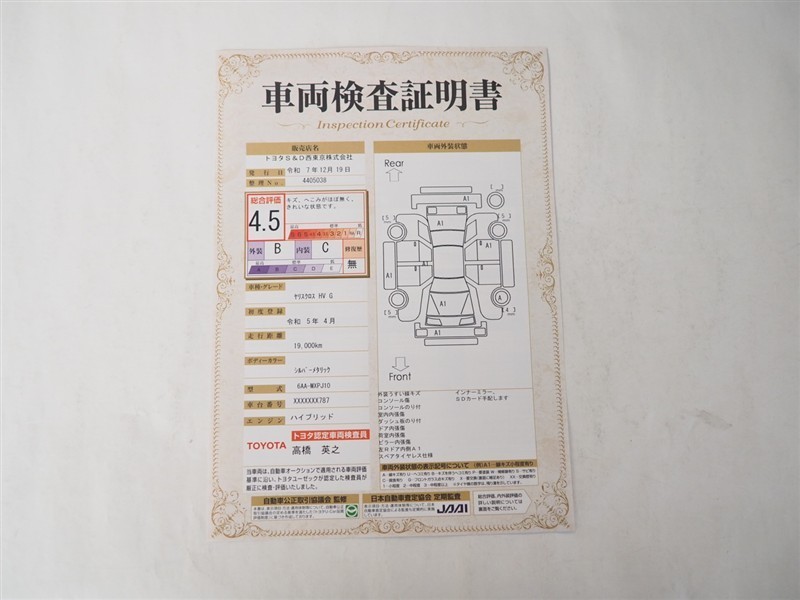詳細及び現状の車両状態につきましては、店舗スタッフまでお尋ねください。 - 注2)上記と同様の評価点・状態表を「車両検査証明書」として店舗の展示車両に搭載しております。