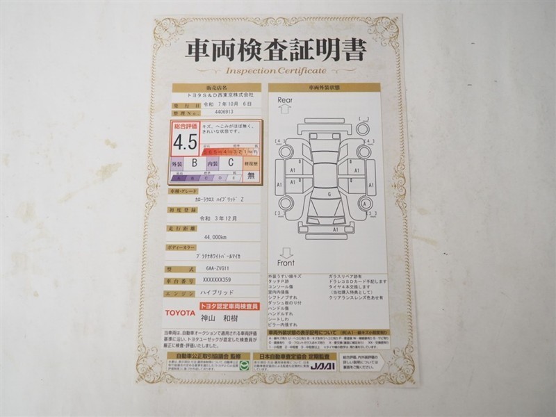 詳細及び現状の車両状態につきましては、店舗スタッフまでお尋ねください。 - 注2)上記と同様の評価点・状態表を「車両検査証明書」として店舗の展示車両に搭載しております。