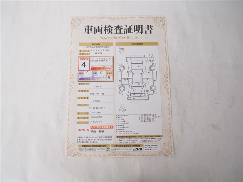 詳細及び現状の車両状態につきましては、店舗スタッフまでお尋ねください。 - 注2)上記と同様の評価点・状態表を「車両検査証明書」として店舗の展示車両に搭載しております。