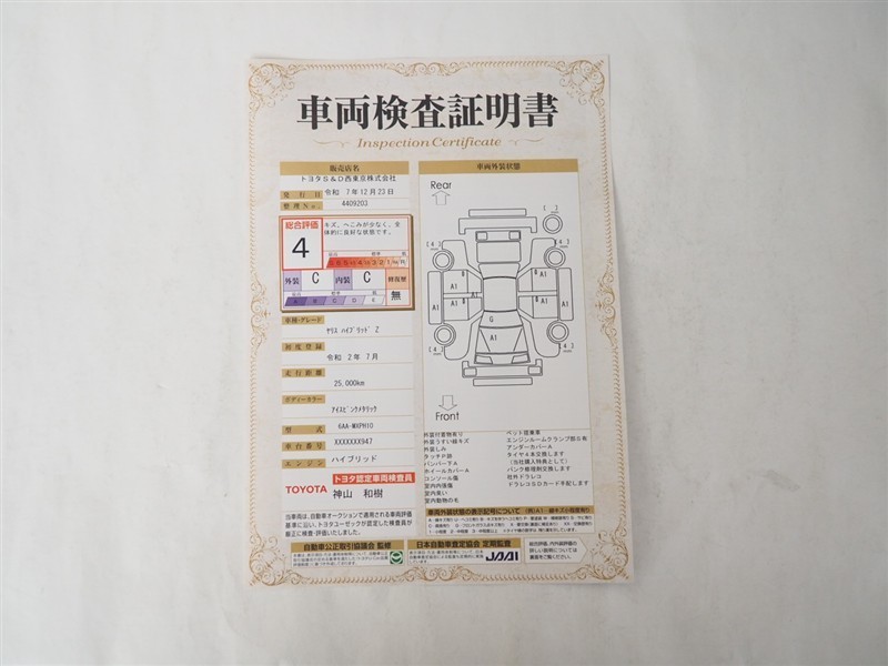 詳細及び現状の車両状態につきましては、店舗スタッフまでお尋ねください。 - 注2)上記と同様の評価点・状態表を「車両検査証明書」として店舗の展示車両に搭載しております。