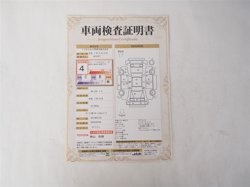 詳細及び現状の車両状態につきましては、店舗スタッフまでお尋ねください。 - 注2)上記と同様の評価点・状態表を「車両検査証明書」として店舗の展示車両に搭載しております。