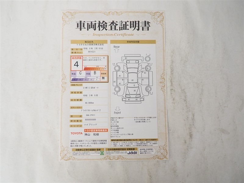 詳細及び現状の車両状態につきましては、店舗スタッフまでお尋ねください。 - 注2)上記と同様の評価点・状態表を「車両検査証明書」として店舗の展示車両に搭載しております。