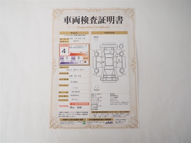 詳細及び現状の車両状態につきましては、店舗スタッフまでお尋ねください。 - 注2)上記と同様の評価点・状態表を「車両検査証明書」として店舗の展示車両に搭載しております。
