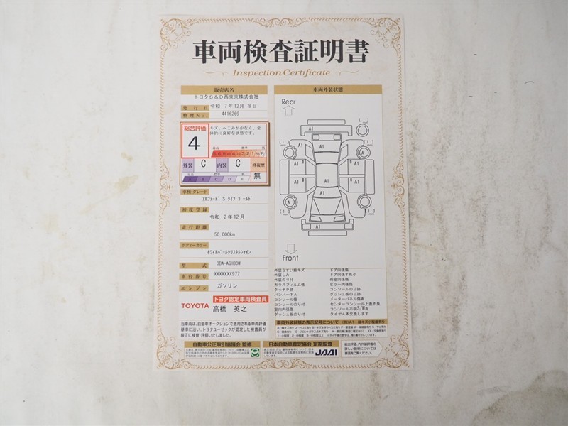 詳細及び現状の車両状態につきましては、店舗スタッフまでお尋ねください。 - 注2)上記と同様の評価点・状態表を「車両検査証明書」として店舗の展示車両に搭載しております。