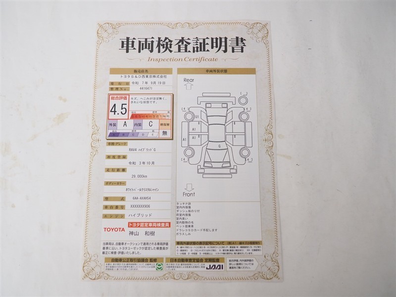詳細及び現状の車両状態につきましては、店舗スタッフまでお尋ねください。 - 注2)上記と同様の評価点・状態表を「車両検査証明書」として店舗の展示車両に搭載しております。