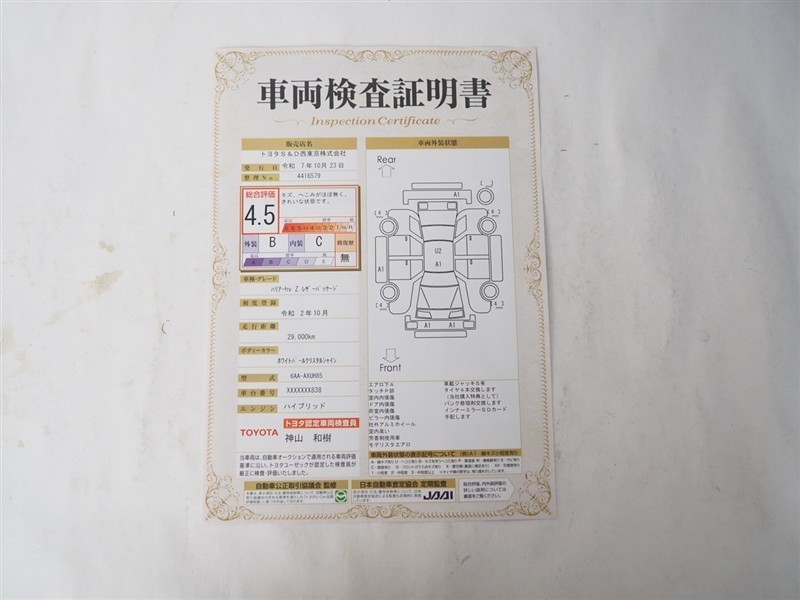 詳細及び現状の車両状態につきましては、店舗スタッフまでお尋ねください。 - 注2)上記と同様の評価点・状態表を「車両検査証明書」として店舗の展示車両に搭載しております。