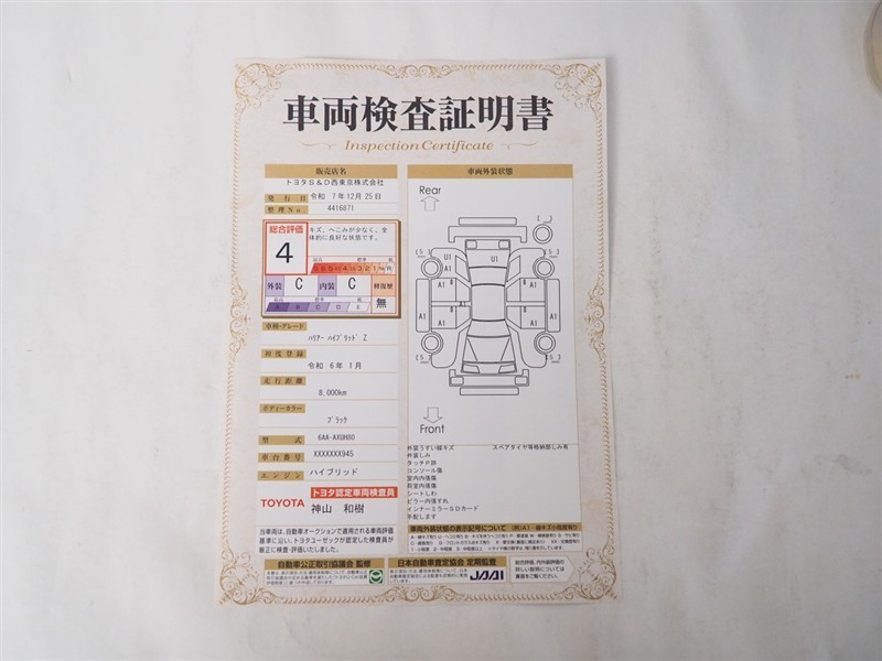 詳細及び現状の車両状態につきましては、店舗スタッフまでお尋ねください。 - 注2)上記と同様の評価点・状態表を「車両検査証明書」として店舗の展示車両に搭載しております。