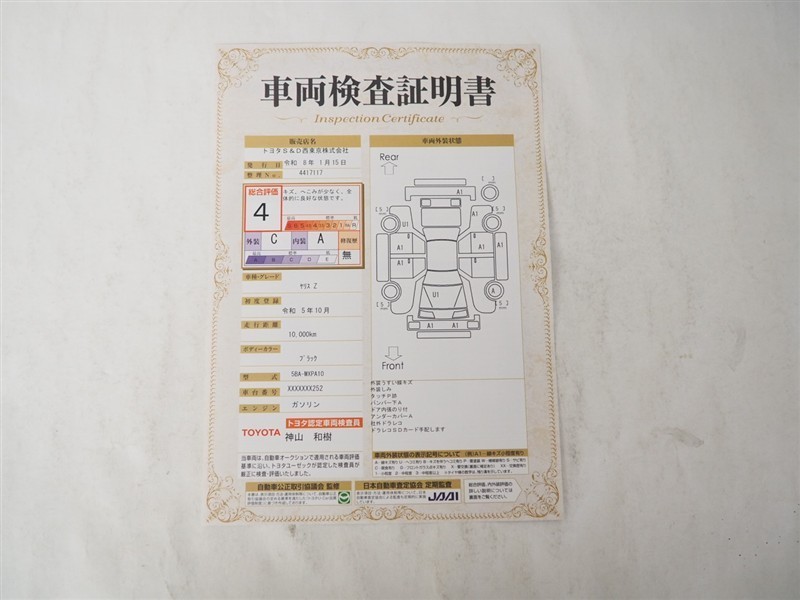 詳細及び現状の車両状態につきましては、店舗スタッフまでお尋ねください。 - 注2)上記と同様の評価点・状態表を「車両検査証明書」として店舗の展示車両に搭載しております。