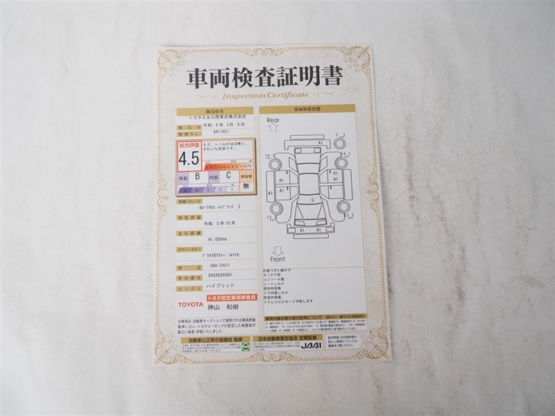 詳細及び現状の車両状態につきましては、店舗スタッフまでお尋ねください。 - 注2)上記と同様の評価点・状態表を「車両検査証明書」として店舗の展示車両に搭載しております。