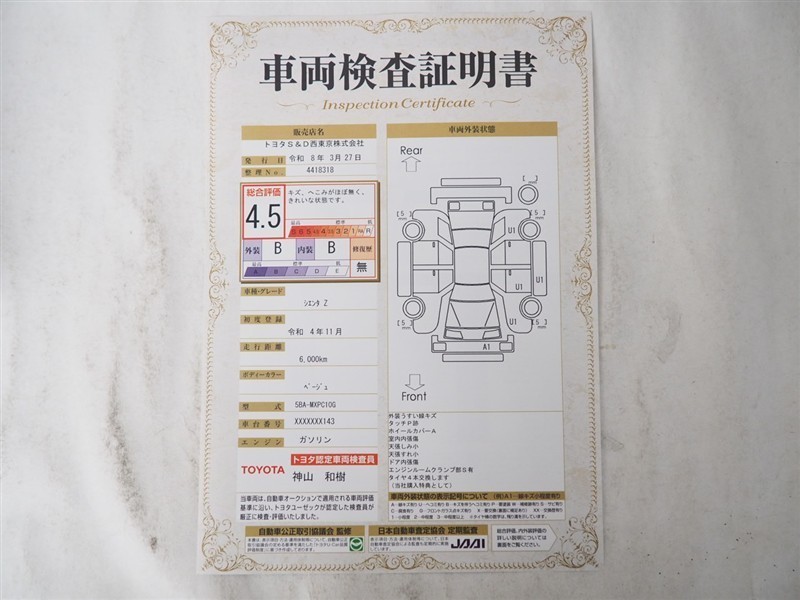 詳細及び現状の車両状態につきましては、店舗スタッフまでお尋ねください。 - 注2)上記と同様の評価点・状態表を「車両検査証明書」として店舗の展示車両に搭載しております。