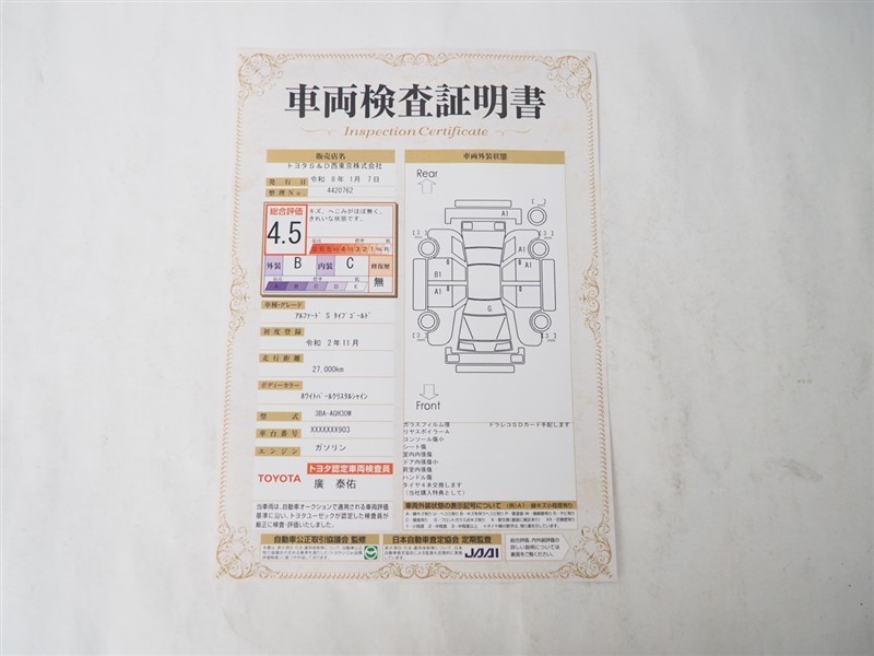 詳細及び現状の車両状態につきましては、店舗スタッフまでお尋ねください。 - 注2)上記と同様の評価点・状態表を「車両検査証明書」として店舗の展示車両に搭載しております。